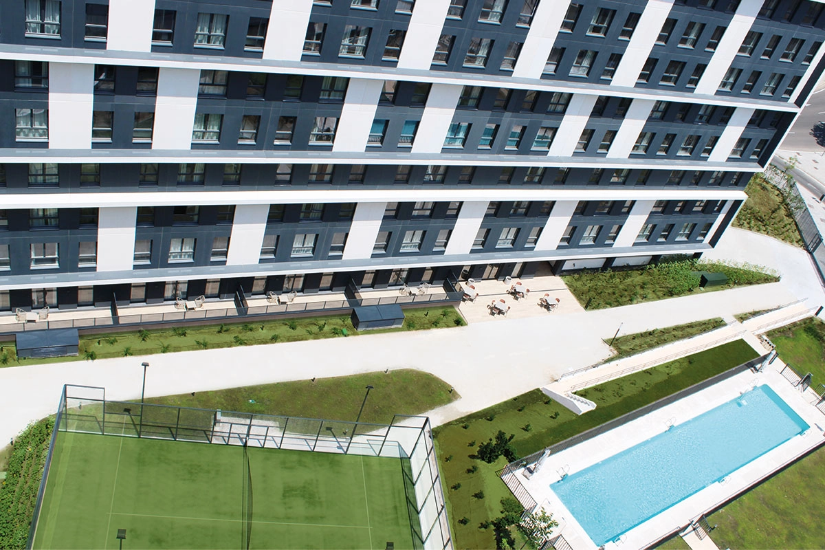 Welco Living Valdebebas se integra en un entorno residencial de reciente construcción, con edificios modernos y zonas comunes como piscina, amplias zonas ajardinadas y pista de pádel, pensadas para mejorar tu calidad de vida y ofrecer un entorno cómodo, práctico y equilibrado.