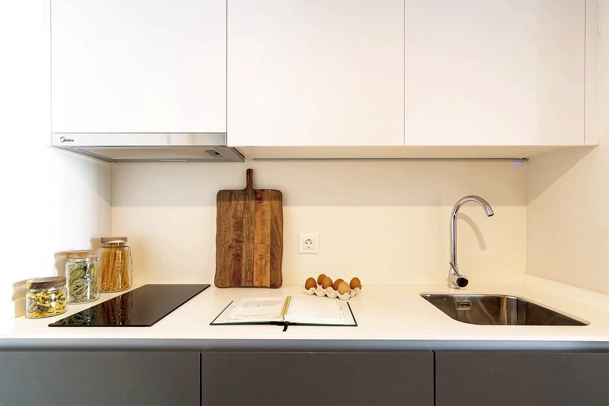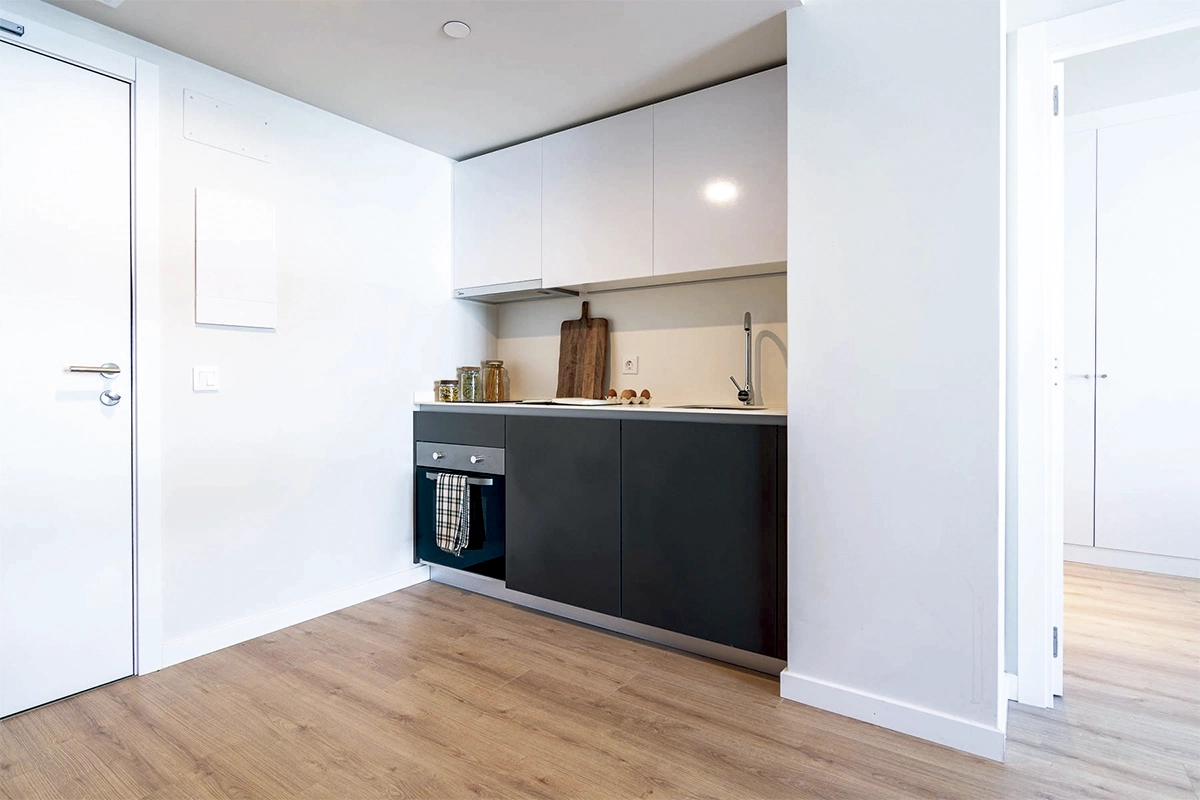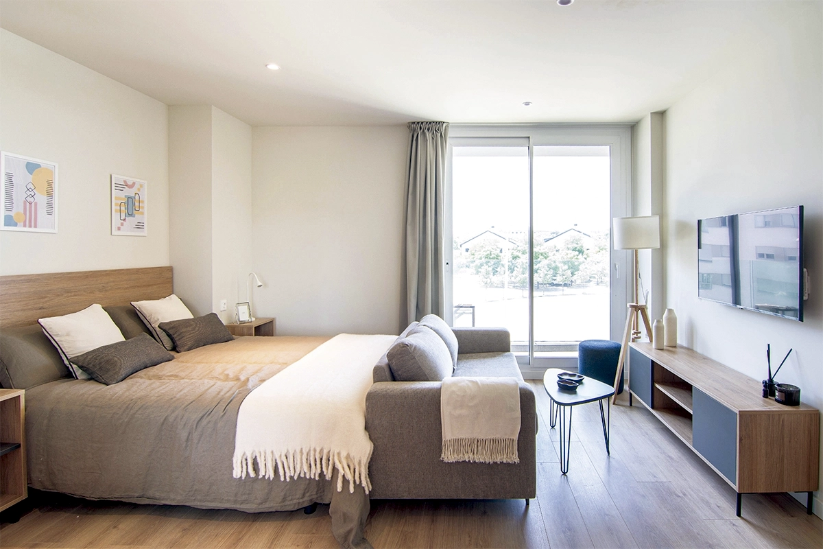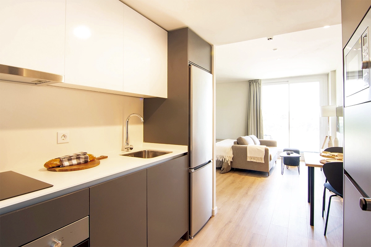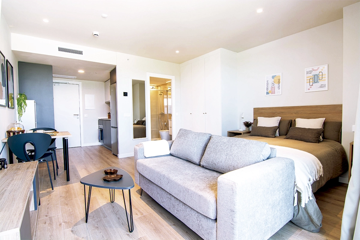 Espacios funcionales de 31,88 m² con balcón privado, totalmente equipados y listos para entrar. Ideales para estancias cortas o temporales.